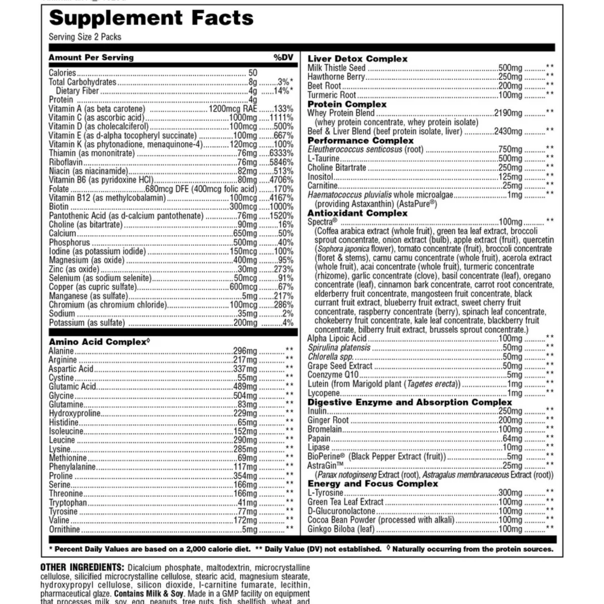 Digestive Enzyme & Absorption Complex: Inulin, ginger root, bromelain, papain, lipase, BioPerine®, and AstraGin® to improve digestion and nutrient utilization.