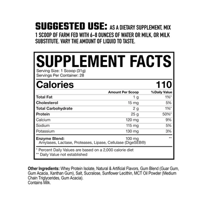 This fast-digesting formula is low in fat and carbohydrates, making it ideal post-workout or anytime you need a quick protein hit without the bloat. Enhanced with DigeSEB® enzyme blend for superior digestion and absorption, Farm Fed ensures every gram of protein is efficiently utilized. The result — smoother digestion, faster recovery, and a clean, rich flavor that makes hitting your macros easy. Farm Fed is the standard for purity and performance in whey isolate nutrition.