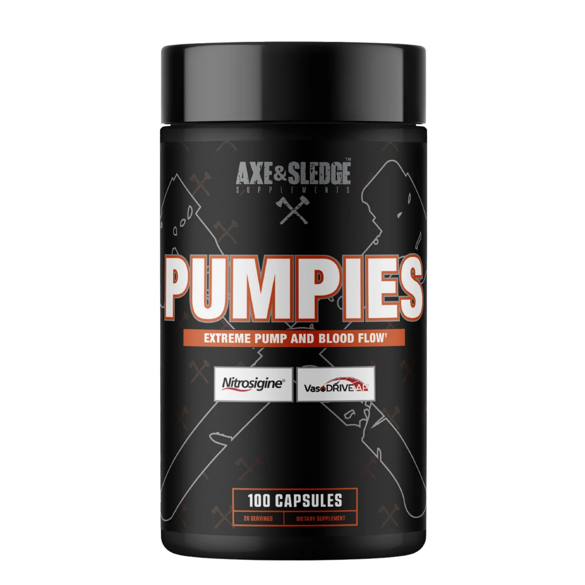 Axe & Sledge Pumpies is a powerhouse nitric oxide capsule formula designed to maximize blood flow, vascularity, and muscle fullness — without stimulants. It’s a clean, hard-hitting pump amplifier for athletes who want their muscles to perform and look as strong as they feel.
