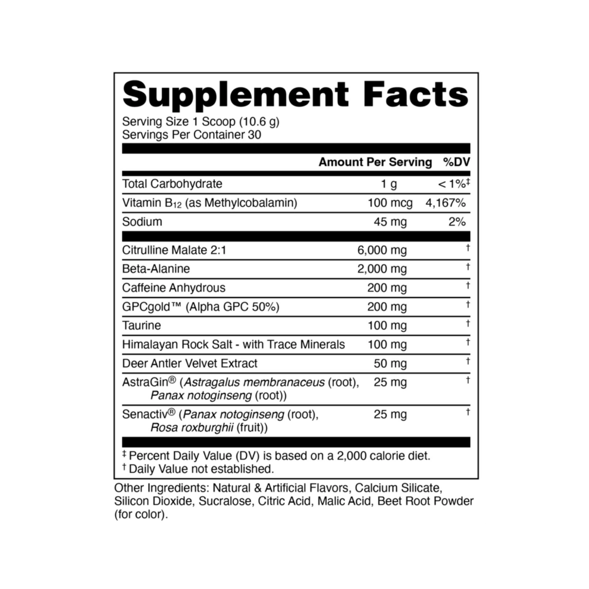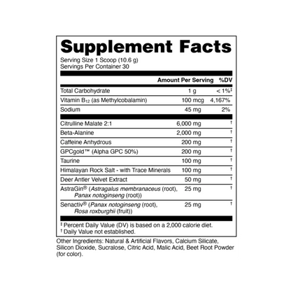 This formula hits hard with 6,000 mg of Citrulline Malate for blood flow, 2,000 mg of Beta-Alanine for endurance, and 200 mg of AlphaSize® Alpha GPC for razor-sharp mental drive. Taurine and Himalayan Rock Salt round out hydration and contraction strength, while AstraGin® and Senactiv® elevate nutrient uptake and recovery efficiency. With 200 mg of caffeine, you get clean, reliable drive — not chaos. If you’re looking for a pre-workout that pushes performance without sacrificing control, this is the one.