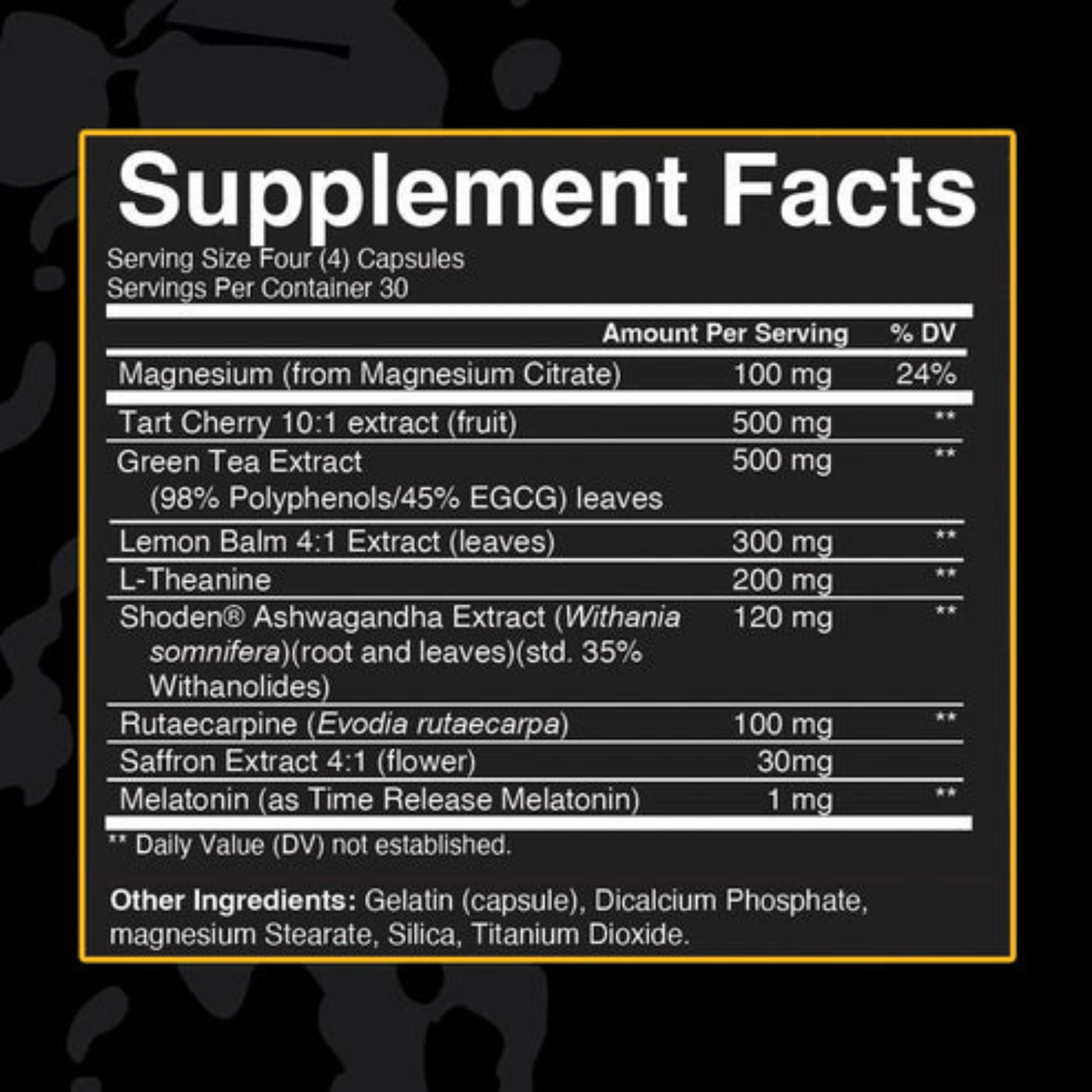 Green Tea Extract (98% Polyphenols / 45% EGCG) – 500 mg Provides antioxidant support and helps regulate stress response overnight.