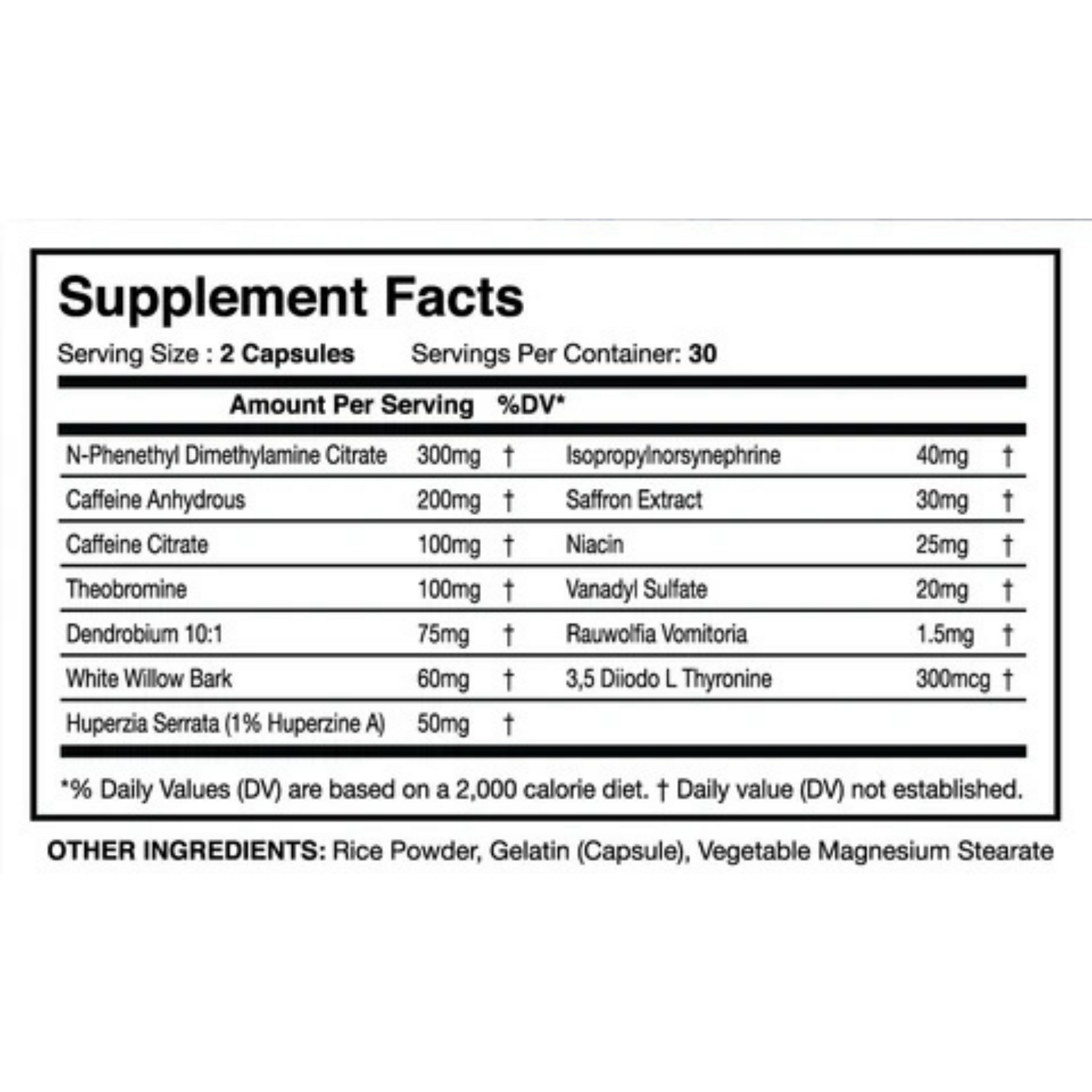 Focus & Cognitive Support: IsoPhloroglucinol (40mg), N-Methyl L-Tyrosine (300mg) — enhanced focus, mood support, and elevated neurological drive during training or cutting phases.